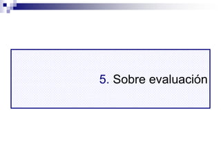 El documento describe el proceso de evaluación educativa. Este implica recoger información sobre lo que será evaluado usando instrumentos de evaluación, valorar los objetivos de aprendizaje logrados en base a criterios de evaluación, y brindar retroalimentación a estudiantes y docentes. La evaluación puede usarse para diagnosticar saberes estudiantiles, monitorear progreso, y tomar decisiones sobre acreditación. Puede involucrar autoevaluación, coevaluación entre pares y docentes, e instrumentos como pruebas, portafolios y rúbricas.
