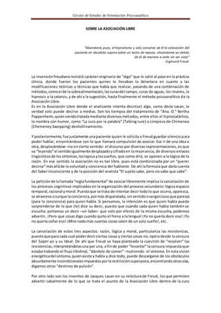El documento describe la asociación libre, un método central del psicoanálisis introducido por Freud. Originalmente, Freud usaba métodos como la hipnosis, pero una paciente le pidió guardar silencio para poder hablar libremente, lo que llevó a Freud a descubrir la "compulsión de asociar" donde el paciente dice todo lo que le viene a la mente sin censura. Más tarde, Lacan describió la asociación libre como una manera de revelar el "saber inconsciente" a través de la constatación de cómo el lengu