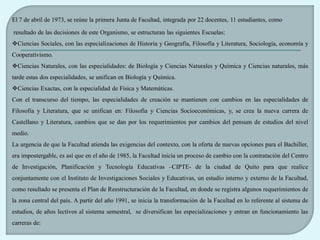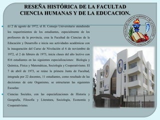 La Facultad de Ciencias Humanas y de la Educación de la Universidad Técnica de Ambato comenzó en 1972 con carreras en ciencias naturales y sociales. A lo largo de los años se han agregado nuevas carreras, especializaciones y programas de posgrado. Actualmente la facultad forma profesionales de tercero y cuarto nivel en ciencias humanas y educación a través de investigación y vinculación con la comunidad.
