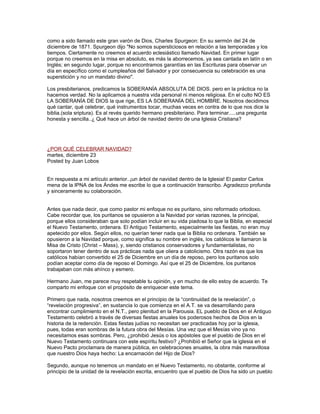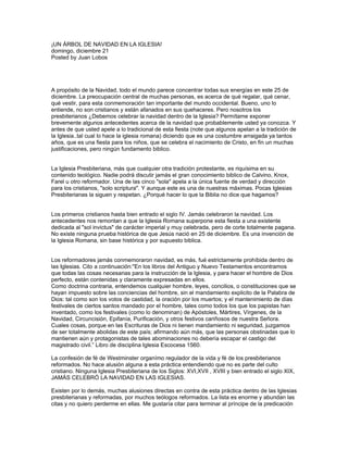 El documento discute la celebración de la Navidad dentro de la iglesia presbiteriana. Aunque los primeros cristianos y los reformadores no celebraron la Navidad, el autor argumenta que la iglesia puede celebrar los grandes hechos de Dios como la encarnación de Cristo. Si bien la fecha de la Navidad tiene orígenes paganos, la iglesia puede usarla para celebrar el nacimiento de Jesús y anunciar al mundo que Dios envió a su Hijo para salvarnos. La celebración cristiana de la Navidad se diferencia de las celebra