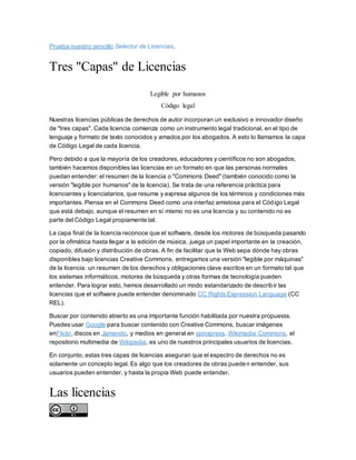 El documento describe las licencias Creative Commons, que permiten a los creadores mantener los derechos de autor de sus obras mientras permiten su uso por otros bajo ciertas condiciones. Las licencias tienen tres capas: código legal, resumen legible para humanos y descripción legible para máquinas. Existen seis licencias principales que varían en si permiten uso comercial y creación de obras derivadas.