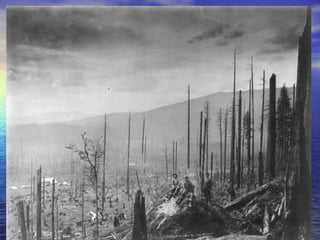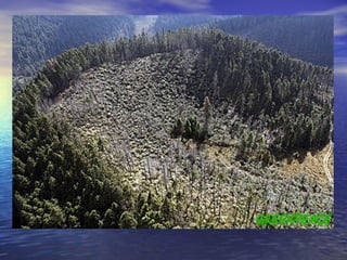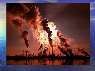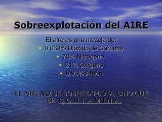 El documento habla sobre la contaminación del aire y el agua, y la sobreexplotación de recursos naturales como el agua y los seres vivos. Explica que el aire no se sobreexplota sino que se contamina con sustancias introducidas por el hombre. También describe que el agua es un recurso limitado, con solo el 0.8% disponible para el consumo humano, y cómo se contamina con residuos industriales y aguas residuales. Además, señala algunas causas de deterioro de los bosques como ecosistemas y formas