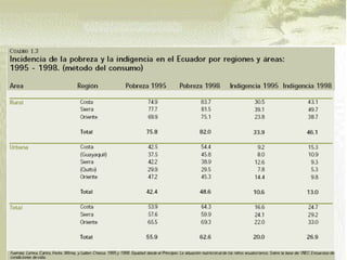 El documento resume el desarrollo humano en Ecuador, incluyendo temas como crecimiento económico, inversión social, equidad, sustentabilidad, productividad y empoderamiento. También analiza los efectos de la crisis económica de finales de los 90 y principios de los 2000, así como las perspectivas para el desarrollo humano sostenible a través de la educación, el empleo y la equidad social. Finalmente, discute el potencial de las nuevas tecnologías para impulsar el desarrollo humano.