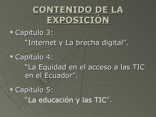 El documento describe la historia y desarrollo de Internet, así como la brecha digital en Ecuador. Detalla los capítulos de la exposición sobre la brecha digital y el acceso a las TIC en el país, e incluye una lista de los integrantes del grupo.