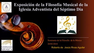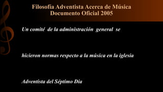 Este documento presenta la filosofía musical de la Iglesia Adventista del Séptimo Día. Expone nueve principios que guían el uso apropiado de la música, tanto sacra como secular, para glorificar a Dios. La música debe ser de alta calidad, equilibrada, y promover el crecimiento espiritual, intelectual y emocional. También debe reflejar valores bíblicos a través de letras y elementos musicales que se unan armoniosamente. La música debe reconocer las contribuciones culturales diversas y mantener un equilib
