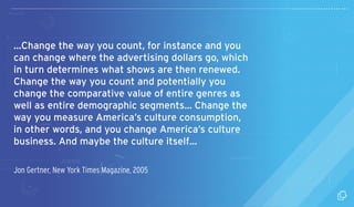 El documento presenta información sobre el consumo de televisión y medios en México. Más de 50 millones de mexicanos están conectados a Internet, y la mayoría usa una segunda pantalla como el celular para comentar el programa de TV que están viendo, principalmente en Facebook. Los canales más conversados son Canal 2, Canal 5 y Azteca 7. Los géneros con mayor conversación son caricaturas, películas, concursos y series.