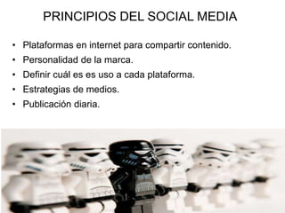 Este documento proporciona orientación sobre el uso efectivo de las redes sociales para empresas. Cubre principios clave como definir la personalidad de marca, publicar contenido de valor diariamente en las plataformas adecuadas, y usar verbos de acción. También analiza canales específicos como blogs, Facebook, Twitter, YouTube, LinkedIn, Instagram y Pinterest, e incluye consejos sobre herramientas, kits de prensa y mantener una perspectiva crítica.