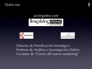 El documento habla sobre la evolución de estar en Internet desde 1996 hasta 2009, pasando por etapas como la arquitectura de la información, usabilidad, diseño de interacción y persuabilidad. Explica luego el concepto de web social y cómo las marcas pueden cambiar el comportamiento de las personas modificando su entorno en lugar de tratar de cambiar a las personas directamente. Finalmente, ofrece consejos sobre cómo participar en la web social para identificar comunidades e inspirar a los usuarios de forma colaborativa.