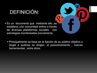 Este documento presenta los pasos clave para desarrollar un plan de medios sociales efectivo. Define el plan de medios sociales como una estrategia para establecer una comunidad en línea a través de plataformas sociales monitoreadas. Explica que el plan debe establecer objetivos medibles, definir el público objetivo, investigar la situación actual, diseñar un enfoque original y trazar una estrategia adecuada que incluya monitoreo, definición, ejecución y medición de resultados. El éxito del plan depende