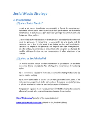 Este documento describe una estrategia de marketing en medios sociales. Explica qué son los medios sociales, sus beneficios para las empresas, las herramientas disponibles como blogs, redes sociales y microblogs, y los pasos para crear un plan de medios sociales incluyendo análisis, objetivos, público objetivo, y medición de resultados.