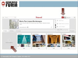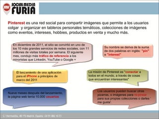 Pinterest es una red social dedicada al intercambio y organización de imágenes en tableros temáticos, permitiendo a los usuarios compartir intereses y productos. Desde su lanzamiento, ha crecido rápidamente, convirtiéndose en uno de los principales servicios de redes sociales y generando tráfico significativo para minoristas. Los usuarios deben optimizar sus perfiles y pines, establecer objetivos claros, y considerar su audiencia para tener éxito en la plataforma.