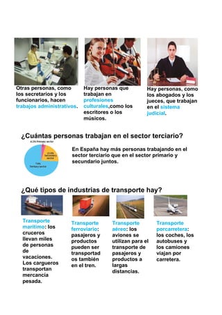 El documento describe el sector terciario y la economía. El sector terciario incluye actividades de servicios como transporte, comunicaciones, educación, sanidad y entretenimiento. Muchas personas trabajan en este sector en España. El documento también discute el uso de dinero y presupuestos familiares, así como diferentes tipos de empresas y el consumo responsable.