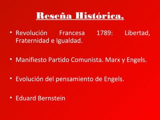 El documento resume la historia y principios de la socialdemocracia. Comienza con la Revolución Francesa de 1789 y los ideales de libertad, fraternidad e igualdad. Luego discute el Manifiesto Comunista de Marx y Engels y cómo las ideas de Engels evolucionaron hacia el reformismo. Finalmente, explica que la socialdemocracia se basa en el socialismo democrático, la justicia social, la solidaridad y el progresismo a través de medios parlamentarios y electorales.