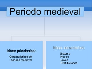El documento describe las características principales del periodo medieval, incluyendo el sistema feudal, el papel de los nobles, las leyes que gobernaban a los campesinos y las prohibiciones impuestas. El sistema feudal determinaba cómo se distribuían las riquezas. Los nobles acaparaban la mayoría de las riquezas pero debían prometer lealtad. Las leyes estipulaban que los campesinos no poseían nada, todo pertenecía al rey. No podían abandonar el reino sin permiso.