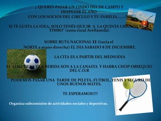 El documento invita a los socios del Circulo y sus familias a pasar un día de campo el 8 de diciembre en una quinta ubicada en la zona rural de Avellaneda, a partir del mediodía, donde podrán disfrutar de la pileta, juegos como fútbol y tenis, y mates, además de almorzar y beber por su cuenta, con chop obsequio del C.O.R.