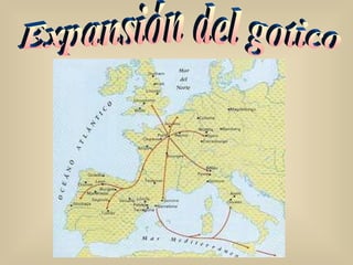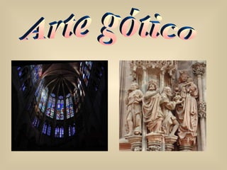 El documento describe las características del arte gótico en arquitectura, escultura y pintura. En la arquitectura gótica, los edificios son más altos con grandes ventanales decorados con vidrieras. Se construyen contrafuertes para soportar la estructura. Las principales catedrales góticas son las de Burgos, Toledo, León y Barcelona. La escultura gótica busca formas más naturales con influencia clásica. El arte mudéjar incorpora elementos hispano-musulmanes en las regiones cristianas