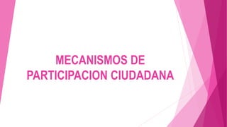 Este documento describe varios mecanismos de participación ciudadana en Colombia, incluyendo el voto, la consulta popular, el plebiscito, el referendo, el cabildo abierto, la iniciativa popular, la revocatoria del mandato y la tutela. Cada uno permite a los ciudadanos colombianos participar en decisiones políticas o proteger sus derechos constitucionales de diferentes maneras.