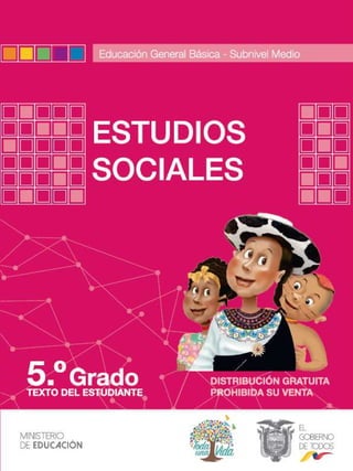 Este documento presenta el contenido general del libro de texto de Ciencias Sociales para quinto grado de educación general básica en Ecuador. Incluye tres bloques temáticos divididos en unidades y temas. El primer bloque trata sobre la historia e identidad del Ecuador y abarca desde la época aborigen hasta la independencia, analizando aspectos como los primeros pobladores, las sociedades agrícolas, los señoríos étnicos, el imperio inca y la conquista española. Los otros bloques examinan los seres humanos en el