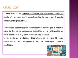 El documento describe el socialismo como un sistema económico basado en la cooperación y propiedad colectiva de los medios de producción. Bajo el socialismo, el gobierno controla la economía para satisfacer las necesidades sociales y eliminar la explotación. El socialismo surgió como una alternativa al capitalismo y el primer país socialista fue la Unión Soviética en 1917.