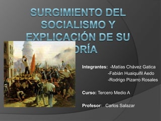 El documento resume los orígenes y tipos principales de socialismo. Explica que el socialismo surgió como una crítica a los efectos de la Revolución Industrial y defendía la propiedad colectiva de los medios de producción. Identifica a Marx y Engels como los fundadores del socialismo científico y menciona varios tipos como el socialismo de mercado, utópico, cristiano y libertario.