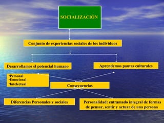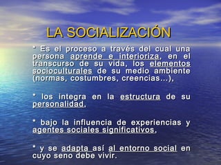 La socialización es el proceso a través del cual una persona aprende e interioriza los elementos socioculturales de su medio ambiente, los integra en su personalidad y se adapta al entorno social. Aprendemos pautas culturales a través de agentes sociales como la familia, la escuela y los medios de comunicación. Este proceso ocurre en etapas como la infancia, la adolescencia y la adultez.