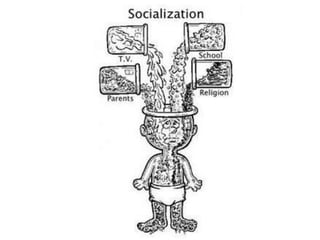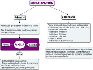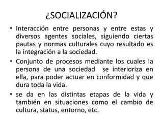 El documento describe el proceso de socialización como la interacción entre personas y agentes sociales que sigue pautas culturales, resultando en la integración de una persona en la sociedad. La socialización ocurre a lo largo del ciclo vital de una persona y en diferentes etapas como la niñez, adolescencia y madurez. Agentes clave de socialización incluyen la familia, escuela, grupos de pares y medios de comunicación.