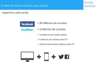El documento describe cómo Social Monitor puede ayudar a los medios a comprender mejor a su audiencia monitoreando comentarios en redes sociales. Explica que la audiencia ya no es pasiva, sino que usa redes sociales de forma simultánea para interactuar sobre los contenidos. Social Monitor ofrece métricas sobre impacto, contenidos populares, usuarios influyentes y competidores para que los medios puedan optimizar su estrategia y generar más engagement con su audiencia.