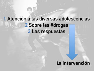 Este documento discute diferentes perspectivas sobre el cannabis y las drogas. Aborda temas como las intervenciones terapéuticas específicas, el consumo de drogas en la sociedad de consumo actual, los riesgos potenciales del consumo de cannabis como la afectación cognitiva y los trastornos de salud mental, y la necesidad de un enfoque que tenga en cuenta los contextos sociales y las identidades en construcción de los adolescentes.