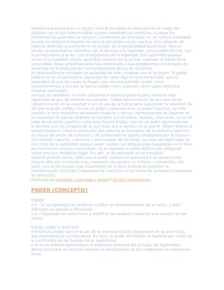 El documento discute las relaciones entre poder, autoridad y liderazgo. Define poder como la capacidad de influir o modificar el comportamiento de otros, mientras que la autoridad es una fuerza moral que permite generar liderazgo. El liderazgo sólo se puede ejercer con autoridad y ayuda a incrementar el poder. También explora los conceptos de sociedad, autoridad, poder y liderazgo.