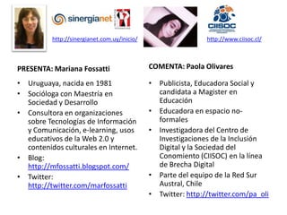 Este documento convoca a un webinar sobre la Sociedad Civil Latinoamericana 2.0 que presentará Mariana Fossatti y comentará Paola Olivares. Abordará temas como la convergencia cultural, la ciudadanía digital, el empoderamiento a través de Internet y ejemplos como la Web 2.0, el software libre y Wikipedia. También discutirá sobre brechas digitales y el futuro de Internet.