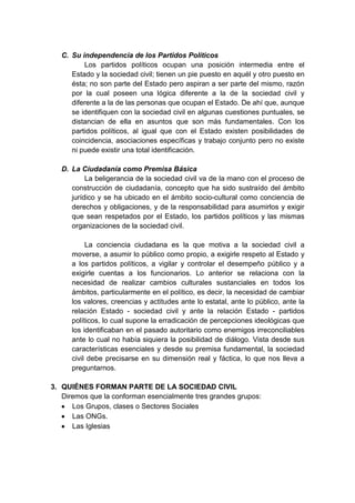 La sociedad civil se refiere a organizaciones no gubernamentales como ONGs, sindicatos y asociaciones. La Federación de Trabajadores en Construcción Civil del Perú es un sindicato nacional que representa a más de 85,000 trabajadores de la construcción en Perú. El sindicato lucha por mejorar las condiciones laborales y promover los derechos de los trabajadores de la construcción.