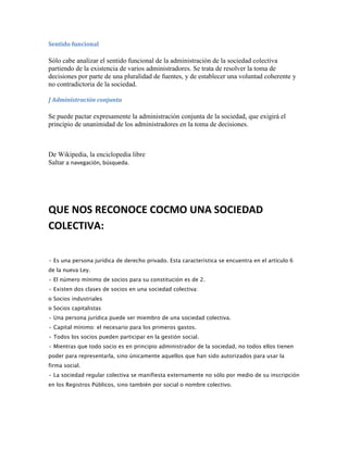 La sociedad colectiva es una persona jurídica formada por al menos dos socios que responden de forma ilimitada y solidaria por las deudas de la sociedad. La administración puede ser legal, privativa o no privativa, dependiendo de lo establecido en los estatutos. La toma de decisiones requiere unanimidad cuando hay varios administradores.