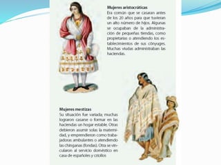 En la colonia, las mujeres se les negaban derechos y su rol se limitaba al trabajo doméstico y cuidado de los niños. Algunas mujeres ingresaban a conventos religiosos donde podían aprender y tener una vida más allá del hogar. Los niños se divertían jugando en las calles y plazas, mientras que los juegos de azar eran populares entre diversos grupos sociales. Las ciudades crecieron y surgieron oficios como los vendedores ambulantes para satisfacer las necesidades de la población.