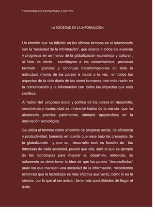 El documento habla sobre la sociedad de la información y su impacto en todos los aspectos de la vida humana. Explica que la sociedad de la información se refiere al progreso social y económico apoyado por la innovación tecnológica. También señala que los avances tecnológicos plantean nuevos desafíos para la educación, ya que los estudiantes están inmersos en un mundo digital y el papel del docente es apropiarse de las herramientas tecnológicas para enseñar de manera efectiva.