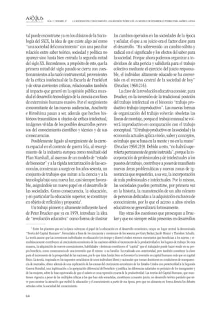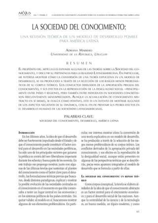 El documento presenta una revisión teórica del modelo de la sociedad del conocimiento y su pertinencia para América Latina. Expone las teorías iniciales que consideraron el conocimiento como factor clave para el desarrollo, aunque omiten los conflictos derivados de la apropiación privada del conocimiento y sus efectos en la desigualdad. El autor analiza estas teorías para mostrar algunos aspectos problemáticos del modelo y prevenir sus peores efectos en el desarrollo de América Latina.