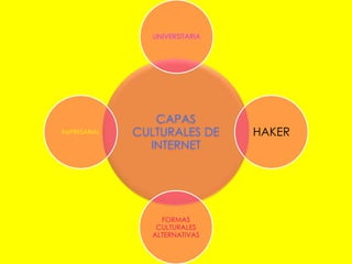 El documento describe diferentes culturas que han surgido en torno al Internet, incluyendo la cultura académica, la cultura de los hackers, formas culturales alternativas y una cultura empresarial. Explica que la cultura académica se centra en la excelencia de la investigación, mientras que la cultura de los hackers busca innovar tecnológicamente. También describe cómo el Internet ha permitido el surgimiento de formas culturales alternativas y una nueva economía basada en redes e innovación tecnológica.