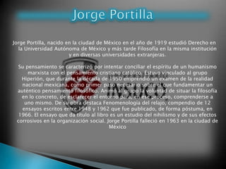 Jorge Portilla analiza en su ensayo "Fenomenología del relajo" cómo los mexicanos tienden a quitarle seriedad a las cosas a través del humor, la burla y la ironía para poder aceptar más fácilmente la realidad. Explica que el "relajo" es una característica cultural mexicana donde nos burlamos incluso de nuestra propia desgracia para alivianar la tensión de la vida. El ensayo busca entender este rasgo nacional para desentrañar mejor la cultura popular del país.