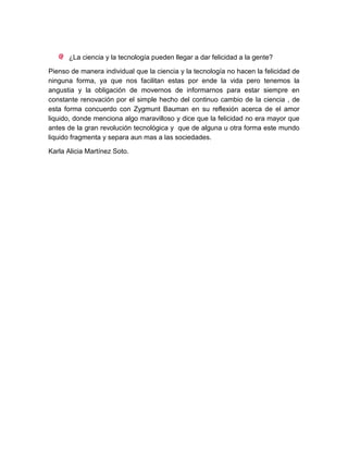 Este documento resume las ideas de Zygmunt Bauman sobre la "vida líquida" y la sociedad moderna. Bauman argumenta que la sociedad contemporánea está cambiando rápidamente debido a factores como la tecnología, lo que lleva a una incertidumbre constante y condiciones que cambian rápidamente para sus miembros. Algunos tienen acceso a esta "modernidad líquida" a través del consumo, mientras que otros son excluidos. El autor también argumenta que la tecnología no necesariamente lleva a la felic