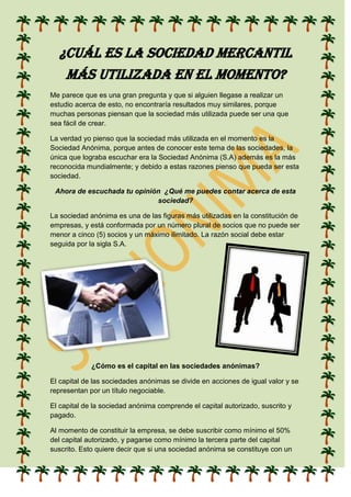 La sociedad anónima (S.A.) es considerada actualmente como la sociedad mercantil más utilizada. La S.A. se compone de un mínimo de 5 socios y un número ilimitado de socios. El capital de una S.A. se divide en acciones de igual valor que son negociables a través de títulos. Para constituir una S.A., al menos el 50% del capital autorizado debe ser suscrito y el 33% del capital suscrito debe ser pagado.