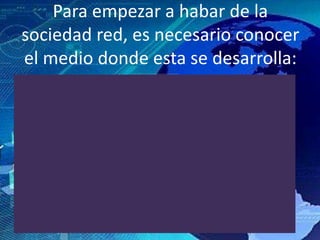La sociedad red, término acuñado por Jan van Dijk y popularizado por Manuel Castells, describe la estructura social actual caracterizada por redes de información que permiten la globalización y una nueva economía basada en el conocimiento. Aunque proporciona ventajas como el acceso a información amplia y la conexión global, también presenta desventajas como desigualdades en el acceso a la información, la necesidad de alfabetización digital y la dispersión social. En este contexto, la sociedad red se ha convertido en el medio principal de interacción entre las personas en el mundo contemporáneo.