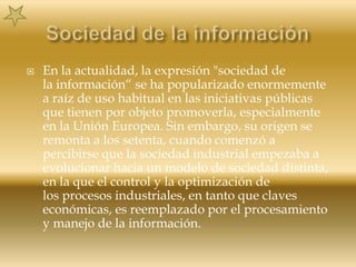 Este documento describe la evolución de la sociedad industrial hacia una sociedad de la información donde el acceso a la información es ilimitado. Define la sociedad de la información como aquella donde los ciudadanos, empresas y administraciones pueden obtener y compartir información de forma instantánea desde cualquier lugar. También introduce el término sociedad del conocimiento como alternativa que incorpora una visión más integral centrada no solo en lo económico.