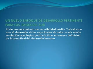 Las sociedades del conocimiento podrían facilitar una nueva definición del desarrollo humano al dar acceso al conocimiento y valorizar el desarrollo de las capacidades individuales. Estas sociedades deberían permitir una mejor aplicación de los derechos humanos y libertades fundamentales, mejorando la lucha contra la pobreza y las políticas de desarrollo. Las Naciones Unidas ven la libertad de expresión como un derecho fundamental y piedra angular de todas las libertades. Actualmente, solo el 11% de la población mundial tiene acceso a Internet, con
