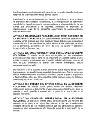 Este documento contiene 302 artículos que regulan aspectos de las sociedades colectivas como la responsabilidad ilimitada de los socios, la autorización necesaria para ciertos actos, la administración y representación de la sociedad, y la formación y uso de la razón social. Se establecen normas sobre la exclusión de socios, el embargo y cesión del interés social, y las decisiones que requieren voto unánime como la enajenación de activos o reformas estatutarias.