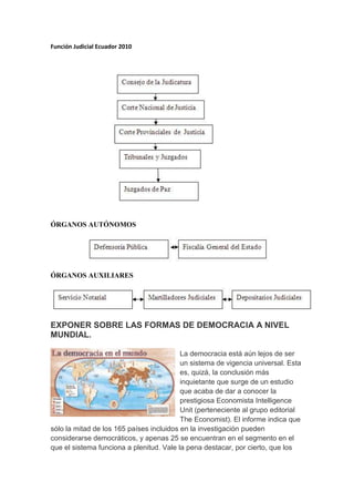 Este documento contiene instrucciones para dos tareas de trabajo autónomo para un curso de sociología. La primera tarea implica elaborar un organigrama de la estructura actual del estado ecuatoriano. La segunda tarea implica explicar las diferentes formas de democracia a nivel mundial y elaborar un gráfico clasificando las instituciones políticas a nivel nacional en Ecuador. El documento también proporciona información sobre varias instituciones políticas en Ecuador.