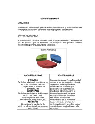 El documento describe las características y oportunidades de los tres sectores productivos principales: primario, secundario y terciario. El sector primario se dedica a la transformación de recursos naturales como la agricultura y la ganadería. El sector secundario incluye industrias como la manufactura de materias primas y maquinaria. El sector terciario ofrece servicios a la sociedad y empresas. El documento también propone dos ideas innovadoras: 1) enfatizar el emprendimiento en la educación para fomentar la independencia, y 2) que la administra