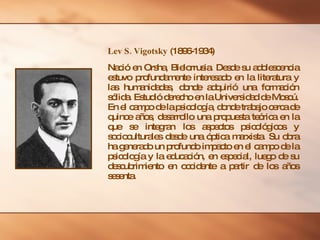 Lev Vigotsky (1896-1934) fue un psicólogo soviético que desarrolló un enfoque sociocultural de la psicología. Propuso que el desarrollo cognitivo de una persona depende de la interacción con otras personas y de la cultura. Argumentó que el aprendizaje ocurre primero a través de la interacción social y luego se internaliza. También destacó la importancia de la "zona de desarrollo próximo" y del "andamiaje" o ayuda pedagógica del maestro.