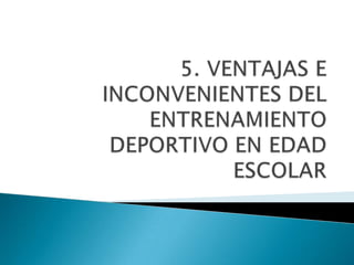 Este documento discute los valores y beneficios del deporte en la educación. En particular, explora cómo el deporte puede transmitir valores sociales positivos como la tolerancia, la integración y la cooperación. También analiza las críticas al deporte en la educación, como la posible deformación de la personalidad de los estudiantes o la falta de individualización. El documento concluye que el deporte puede ser una herramienta educativa valiosa si se implementa de manera que priorice los objetivos formativos sobre la mera competición.
