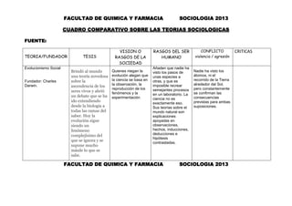 El documento presenta un cuadro comparativo sobre diferentes teorías sociológicas, incluyendo la teoría de la evolución social de Charles Darwin, el funcionalismo de Émile Durkheim y Talcott Parsons, el interaccionismo simbólico de Herbert Blumer, y la teoría del conflicto de Karl Marx y Max Weber. Resume brevemente la tesis central, la visión de la sociedad, y los rasgos del ser humano según cada teoría.
