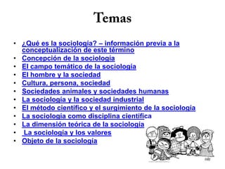 El documento presenta una introducción a los conceptos fundamentales de la sociología. Aborda temas como la definición de sociología propuesta por Augusto Comte, el objeto de estudio de esta disciplina, los diferentes enfoques metodológicos utilizados y la relación entre la sociología, la sociedad y el individuo. Asimismo, analiza los desafíos en torno a la definición de sociología y su evolución como ciencia, así como los roles que pueden desempeñar los sociólogos.