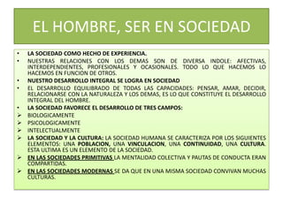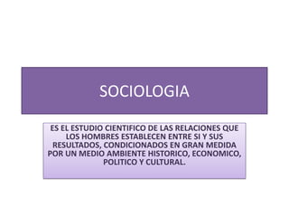 Este documento ofrece una introducción a la sociología como el estudio científico de las relaciones humanas y su influencia por factores ambientales históricos, económicos, políticos y culturales. Explora conceptos clave como la sociedad, la cultura, las estructuras sociales, las clases sociales, el estado, la socialización y el conflicto social.